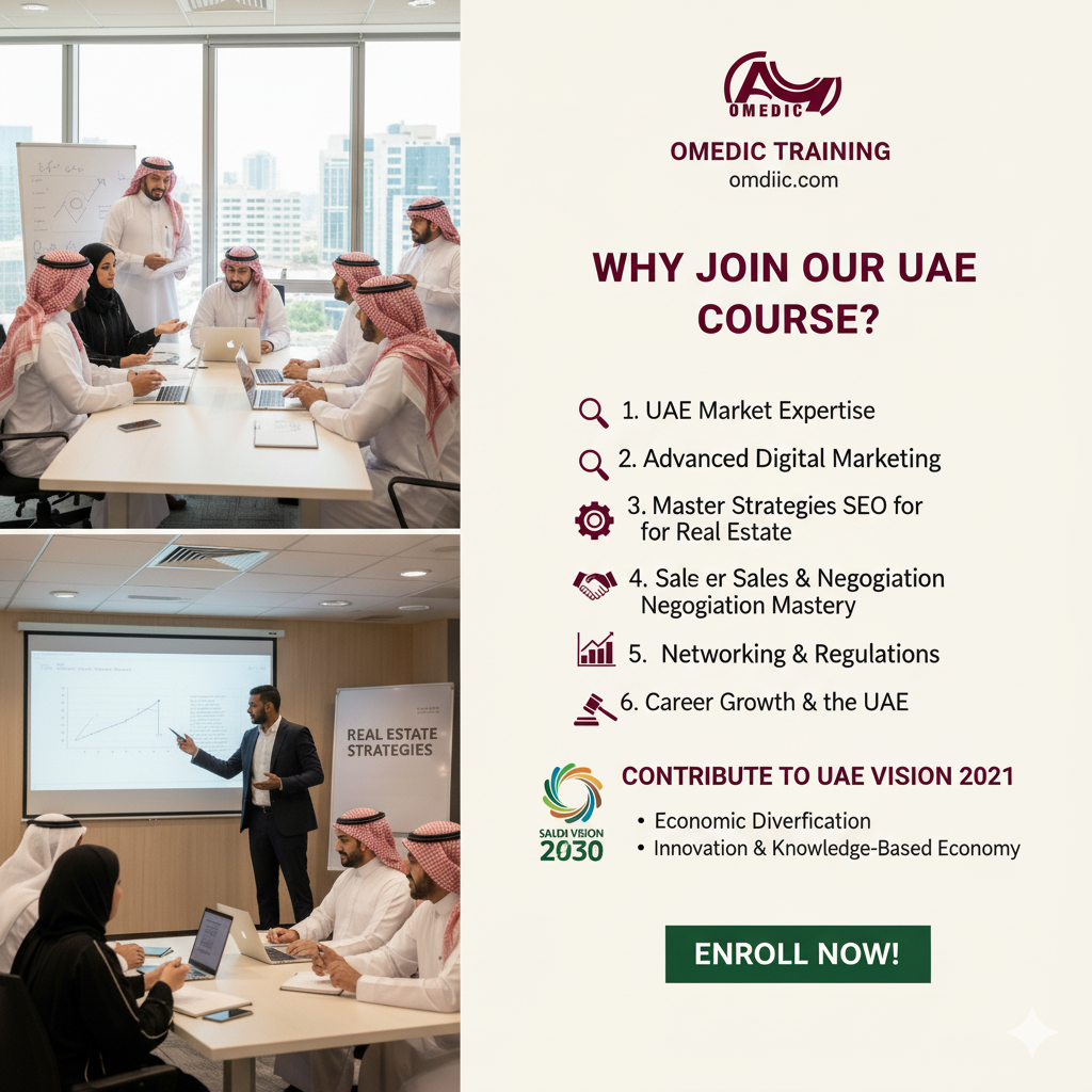 الأسباب التي تدفعك للانضمام إلى دورة التسويق والمبيعات العقارية في الإمارات من أوميديك للتدريب والاستشارات ليست مجرد رفاهية، بل ضرورة استراتيجية إذا كنت تطمح للتميز في سوق عقاري عالمي، شديد المنافسة وسريع التطور.
